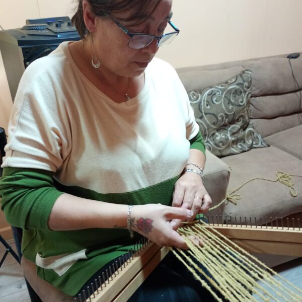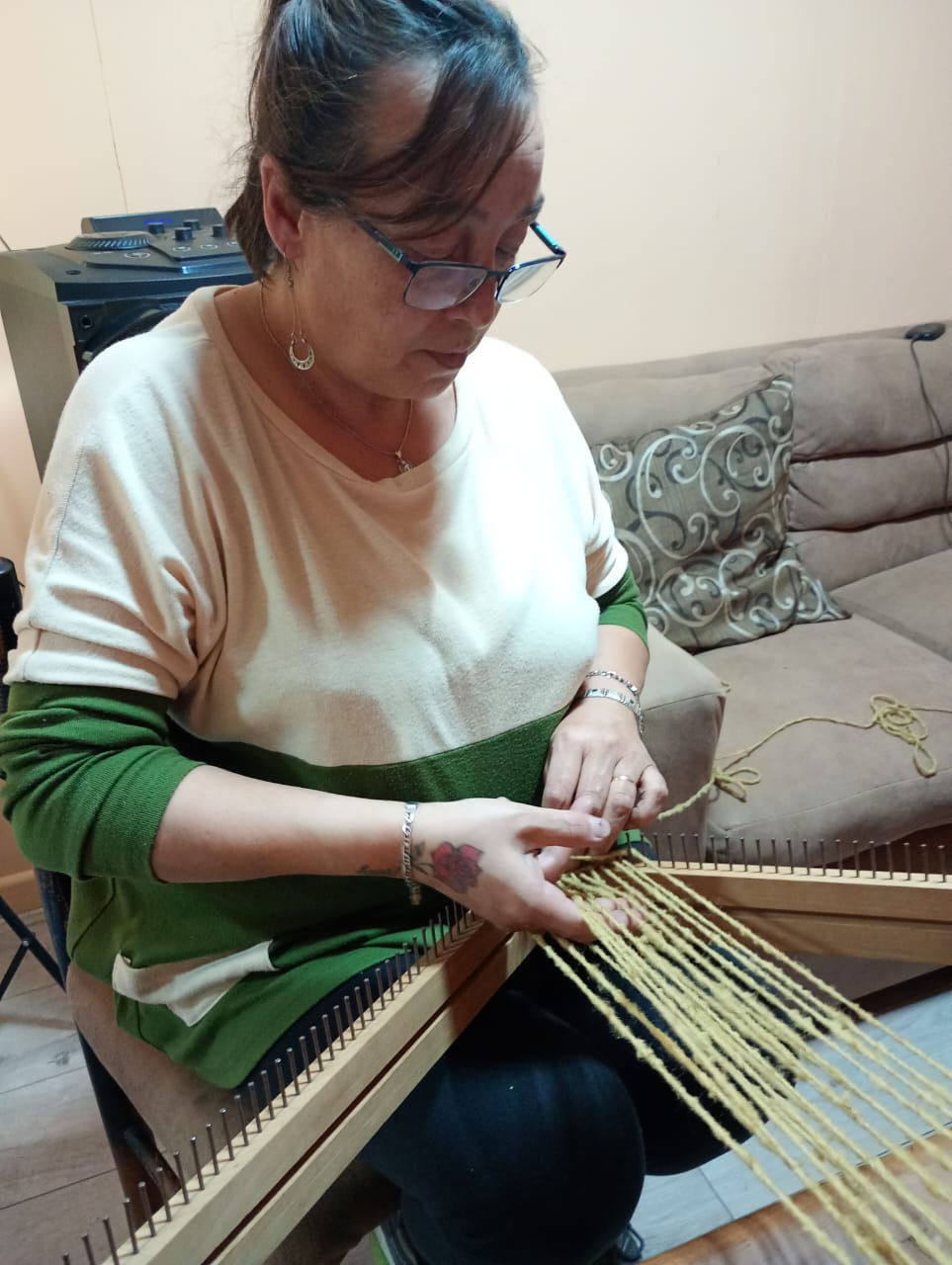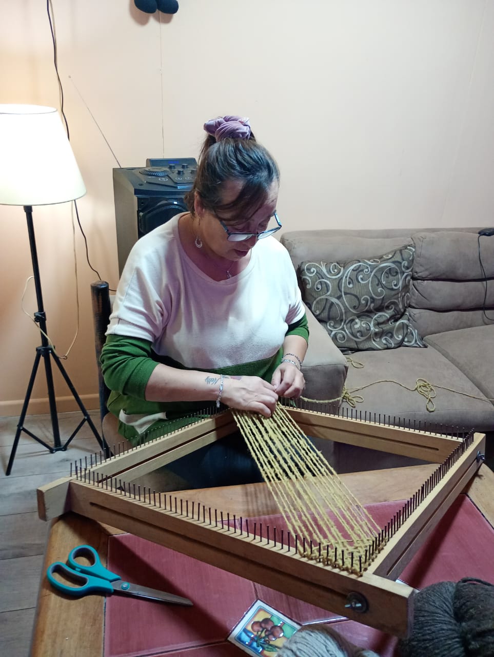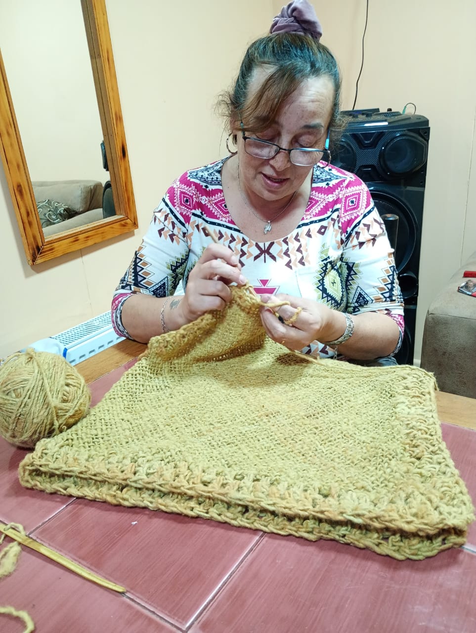 Hola, soy Mariela Cárcamo, nacida y criada en la comuna de Natales. Desde pequeña, me fascinó ver cómo se preparaba, hilaba y lavaba la lana natural de oveja, y cómo mi abuelita creaba prendas hermosas con ella. Hoy en día, he compartido mis saberes con mi hermana y amigas en reuniones de tejido, y sigo rescatando las tradiciones de mis ancestros. Me apasiona innovar y combinar técnicas antiguas con nuevas, como el telar de clavos. ¡Los invito a visitar nuestro emprendimiento @coocreapatagonia! Gracias por acompañarnos en este viaje de rescate y creación.»