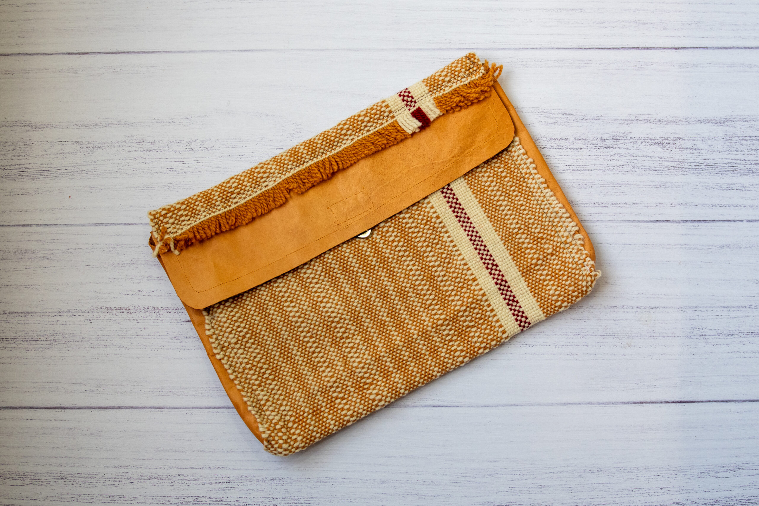 - Tejido en Telar de Calidad: La parte principal del bolso está elaborada con la técnica de telar, utilizando hilos en tonos cálidos y naturales que crean una textura rica y un patrón distintivo. Este tejido no solo es hermoso, sino que ofrece una capa de protección acolchada para tu dispositivo.